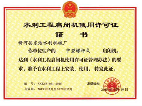 产品符合SL41-93《水利水电工程启闭机设计规范》、SD297-88《QL型螺杆式启闭机系列参数》、 SD298-88《QL型螺杆式启闭机技术条件》、SD315-89、SD296-83等系列国家标准, 多次受到省、市政府部门的嘉奖,并由水利部、农业部授予推荐品牌。 凭过硬的产品质量和合理的产品价格,在全国的水利水电工程建设项目中多次中标, 为水利水电建设做出了卓越的贡献。